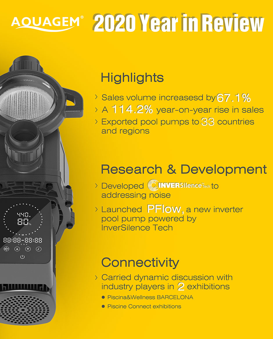 De wereldwijde markt voor zwembadpompen heeft de afgelopen jaren een opmerkelijke impuls gekregen.Rekening houdend met de huidige trends, toekomstperspectieven en de effecten van COVID-19, wordt verwacht dat de markt voor zwembadpompen in de toekomst nog zal groeien.Aquagem speelt in op de marktvraag en blijft vooruitgaan en heeft in 2020 grote doorbraken bereikt.